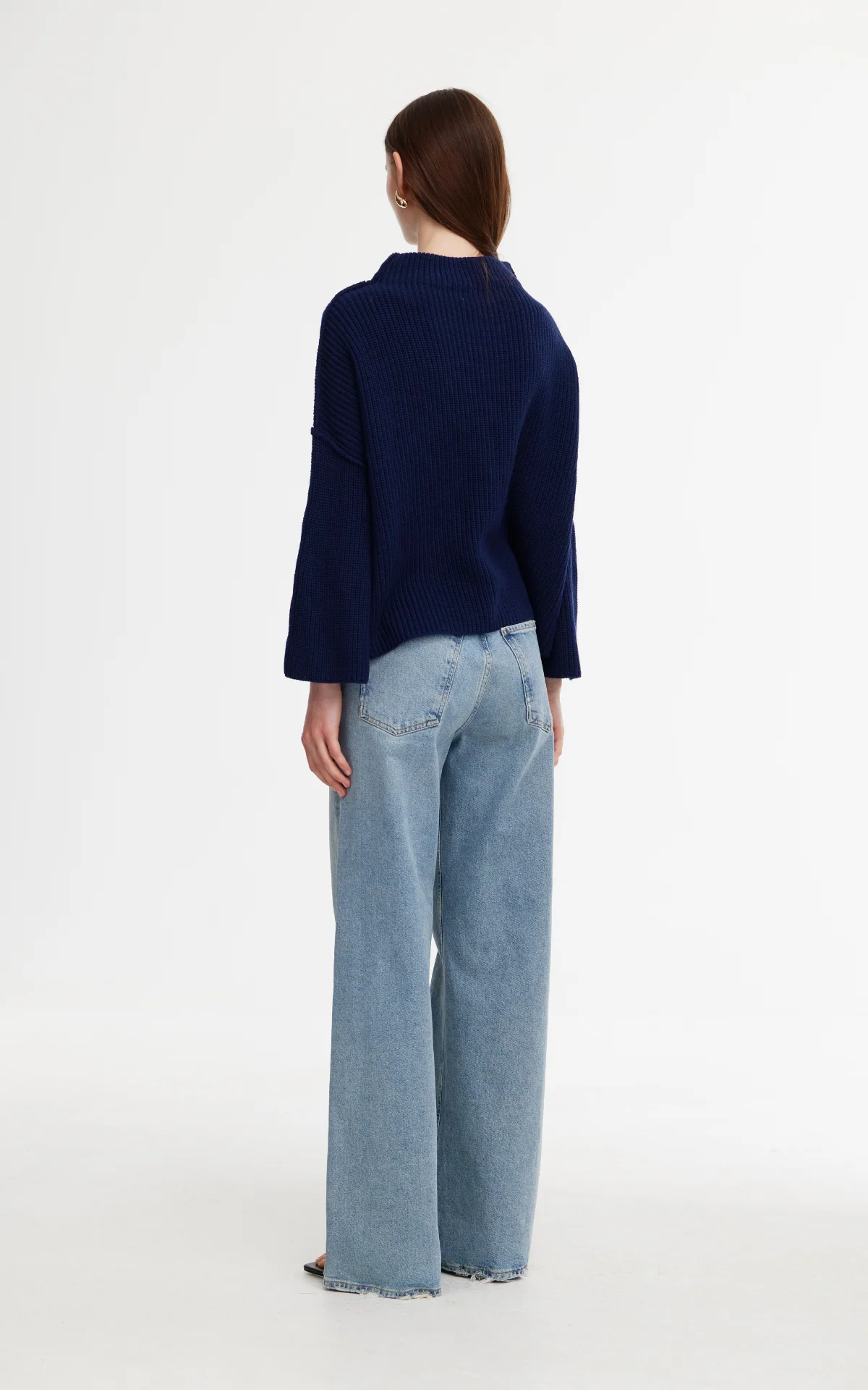 The Abby sweater is a cosy and stylish oversized knit. It features a wide mock neck collar and wide drop-shoulder sleeves with seam detailing.