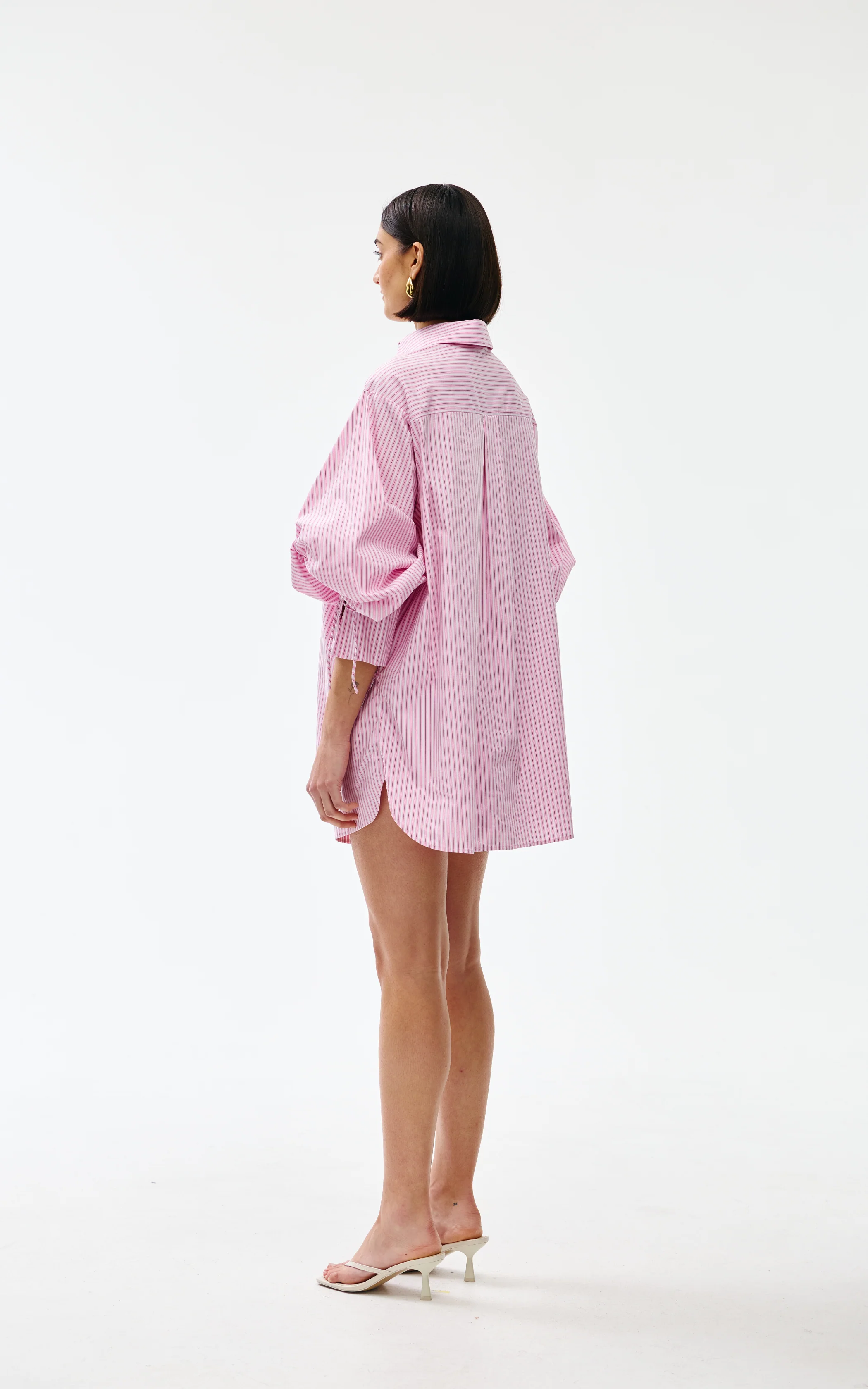 A playful update on a classic, the Ashton Shirt in Pink Pinstripe delivers an effortless oversized silhouette with gathered drawstring sleeves for a modern twist.