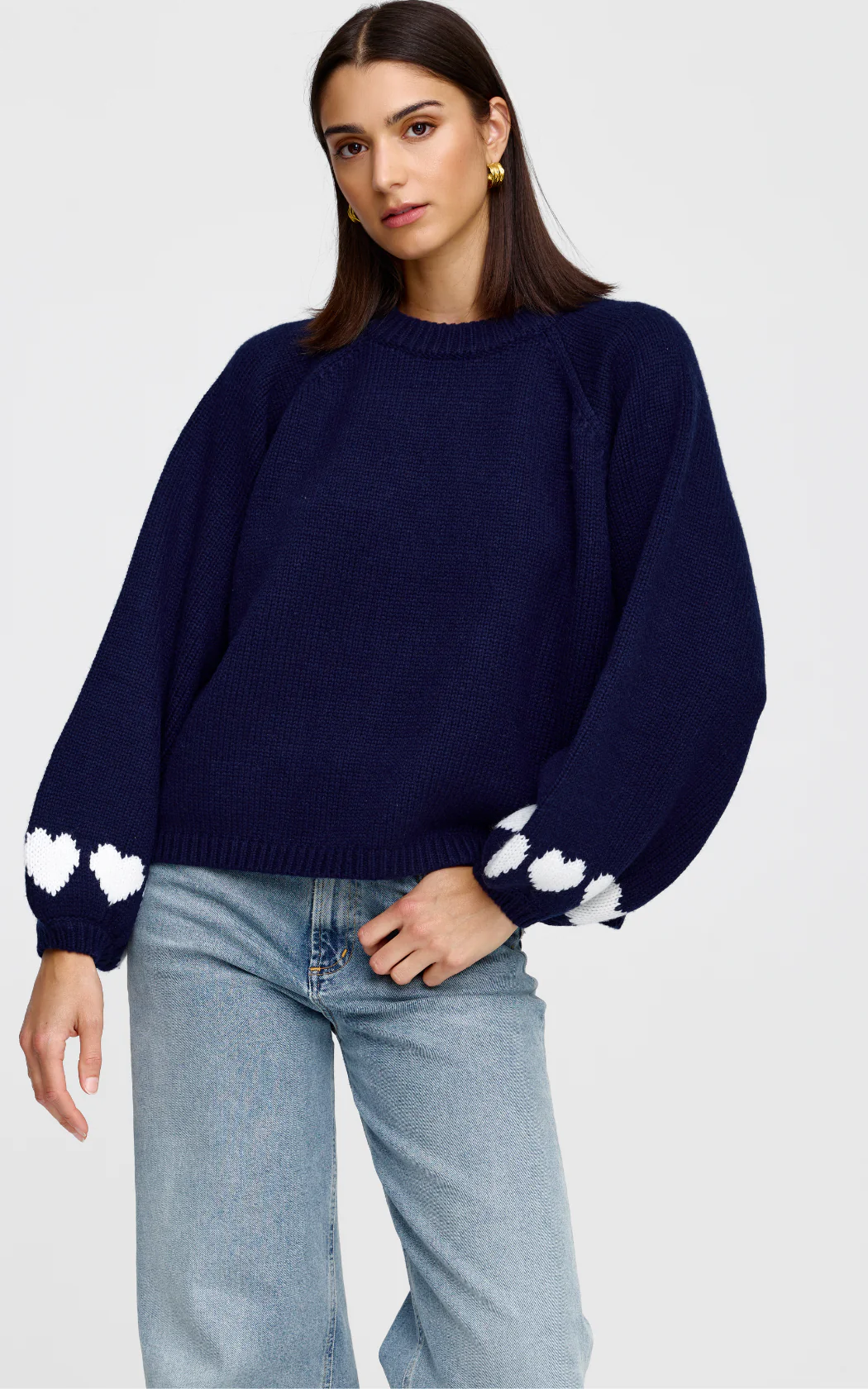 The Cherie Hearts Knit is the perfect way to incorporate a bit of fun into your winter wardrobe. This classic knit shape is brought to life with our intarsia knit heart design that wraps around the sleeves.
