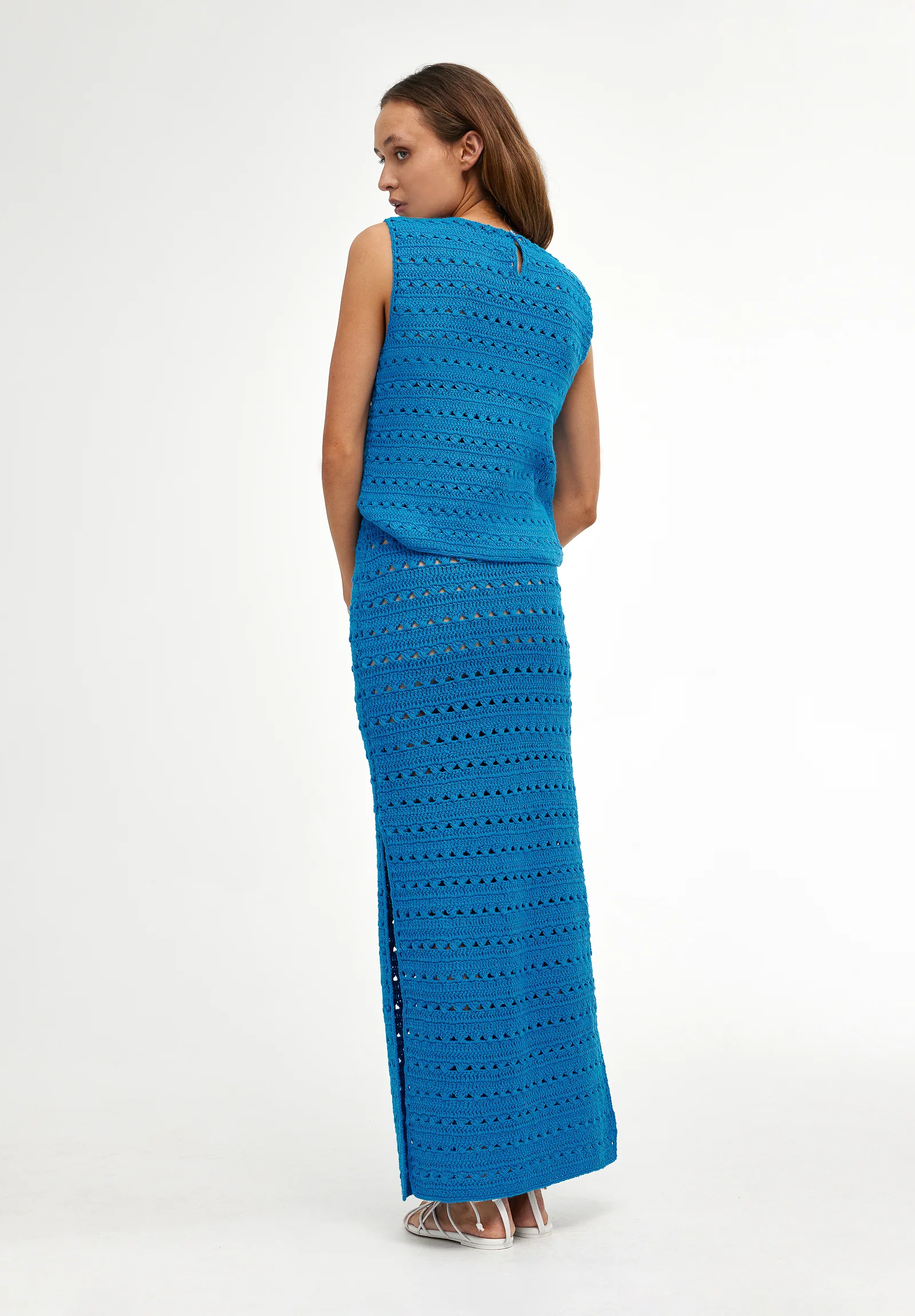 The Laura Skirt in Blue is a straight skirt crafted from a hand crocheted airy 100% cotton yarn. The skirt features a classic straight silhouette with added side vents, an elasticated waistband and a detachable modest slip. Perfect for layering over swimwear or style with the matching Laura Crochet Top for elevated co-ord dressing to take you from day to night.
