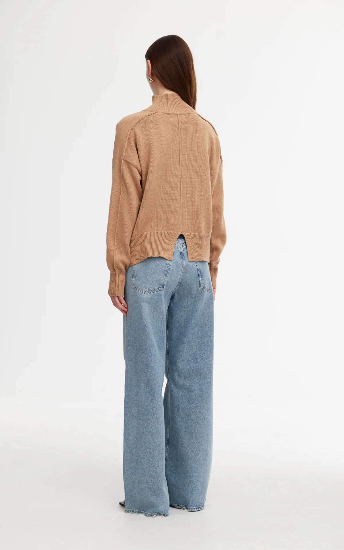 The Mae Jumper is a relaxed, mid weight knit with a high funnel neck and ribbed finishings. It features seam details and a slit opening at the back hem.