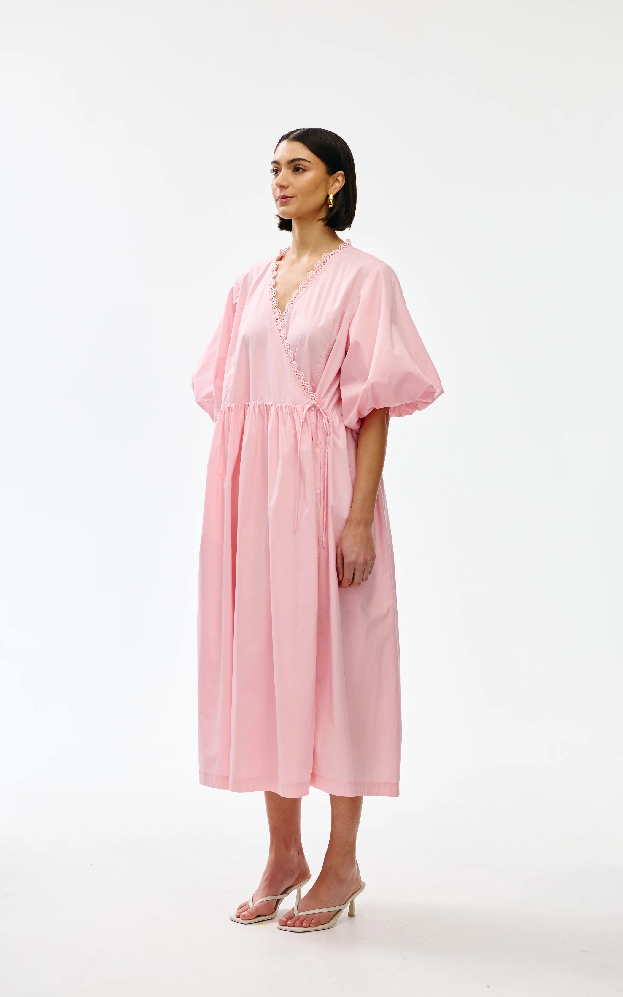 Crafted in soft cotton, this midi-length style features a wrap front with delicate scalloped lace trim, voluminous puff sleeves, in-seam pockets, and a gathered waistline for a flattering silhouette.