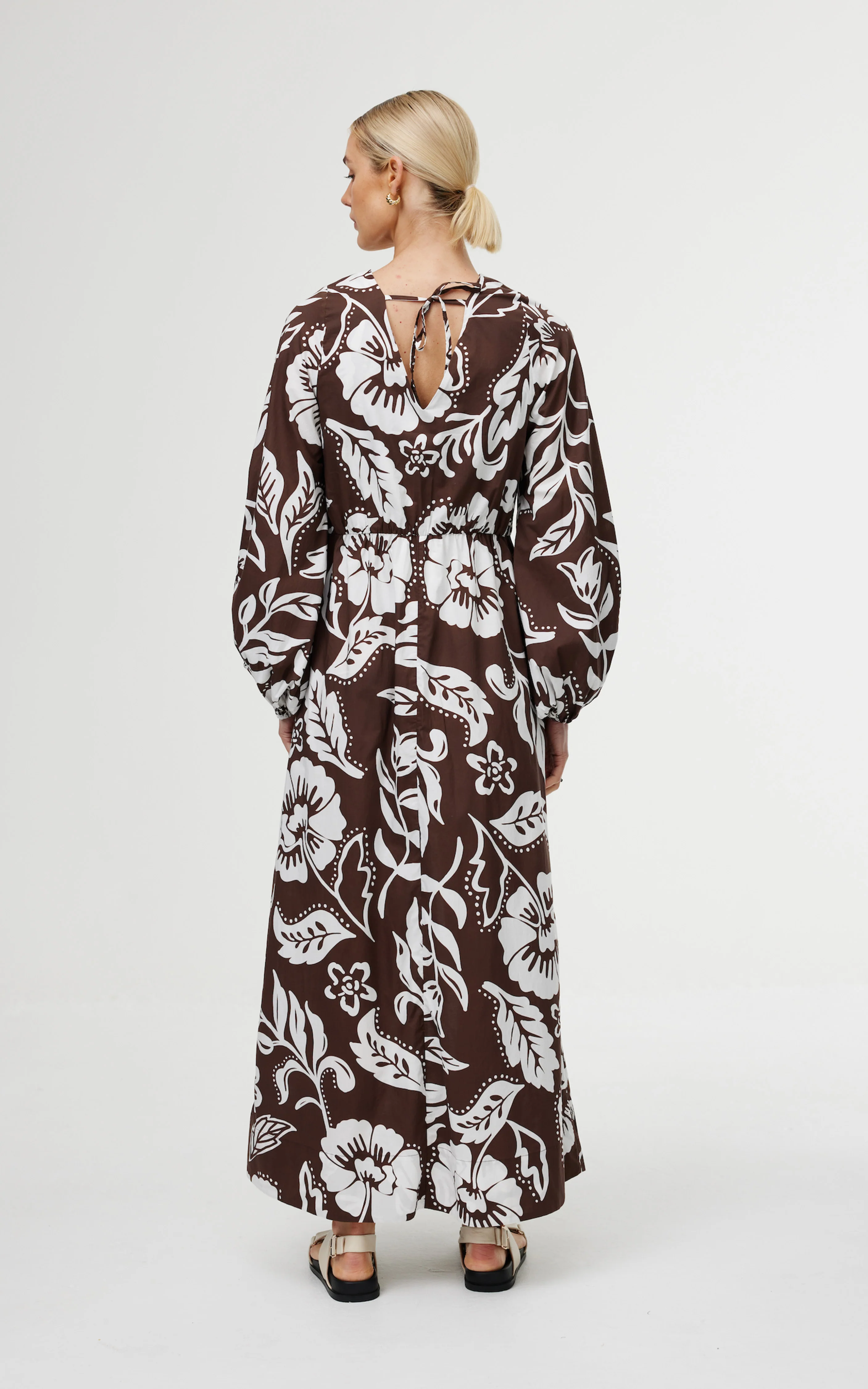 The Marais Dress is a long-sleeved maxi dress with a deep v-neckline. It features a gathered keyhole cutout at the front that is adjustable with a tie. The sleeves are finished with gathered and elasticated cuffs and there is an adjustable tie detail across the back. Marais has in-seam pockets and wide hem finishing.