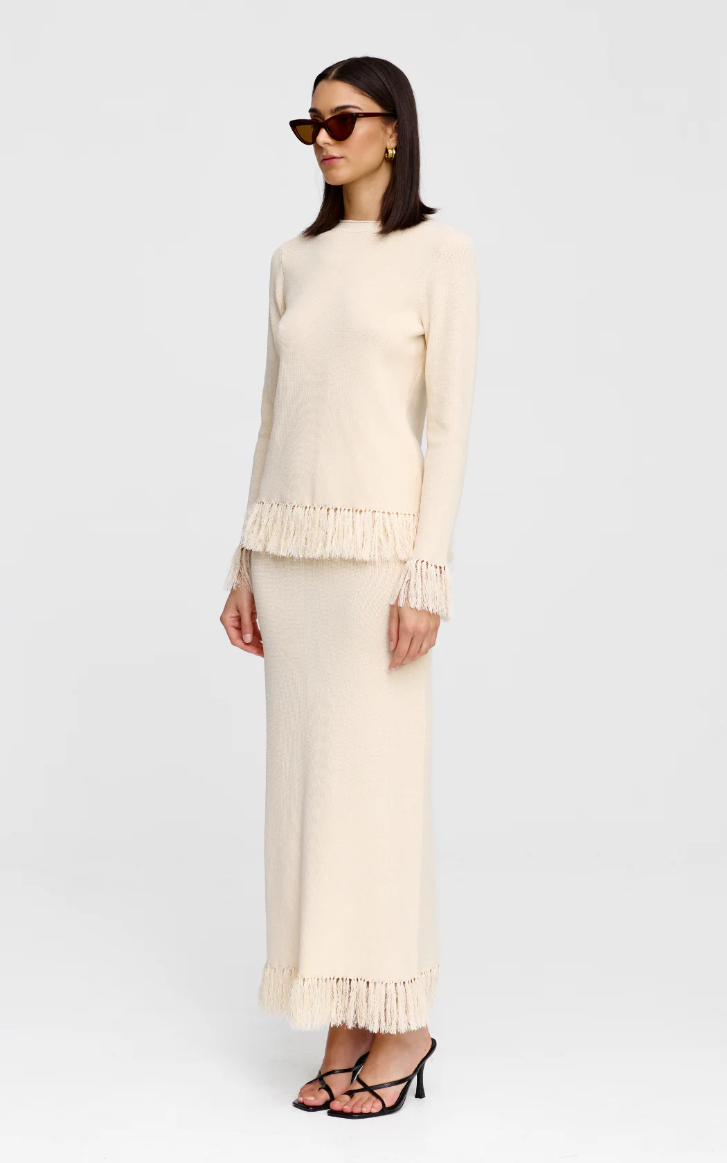 The Marigold Knit skirt is a full-length column shape, elevated by our textural fringing detail at the hem. Pair this piece with the Marigold Knit Top for a luxe and sophisticated look.