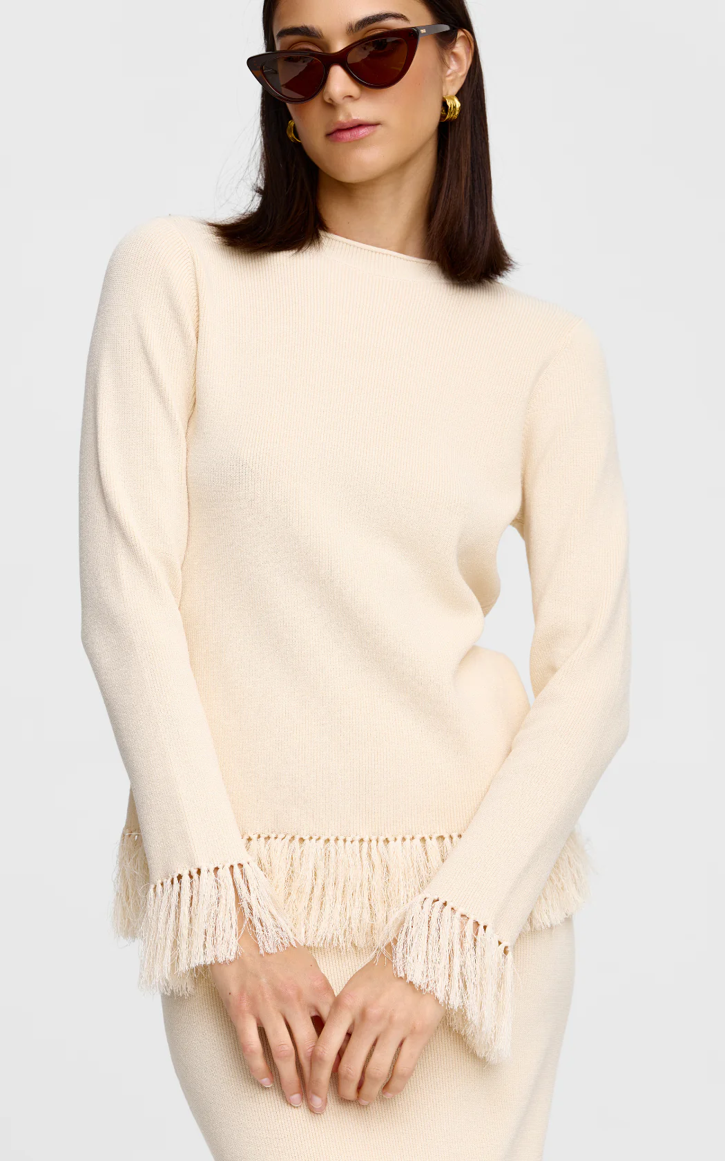 The Marigold Knit top is a classic woven long-sleeve, elevated by our textural fringing detail at the cuffs and hem. Pair this piece with the Marigold Knit skirt for a luxe and sophisticated look.
