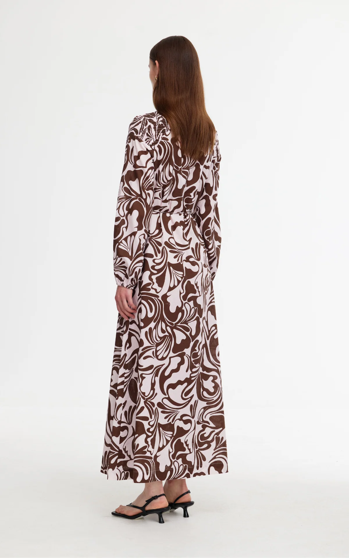 The Posey Dress is a flattering A-line maxi dress. It has ruching details at the shoulders, gathered cuffs and a waist tie with gold toggles. It also features in-seam pockets and a mandarin collar.