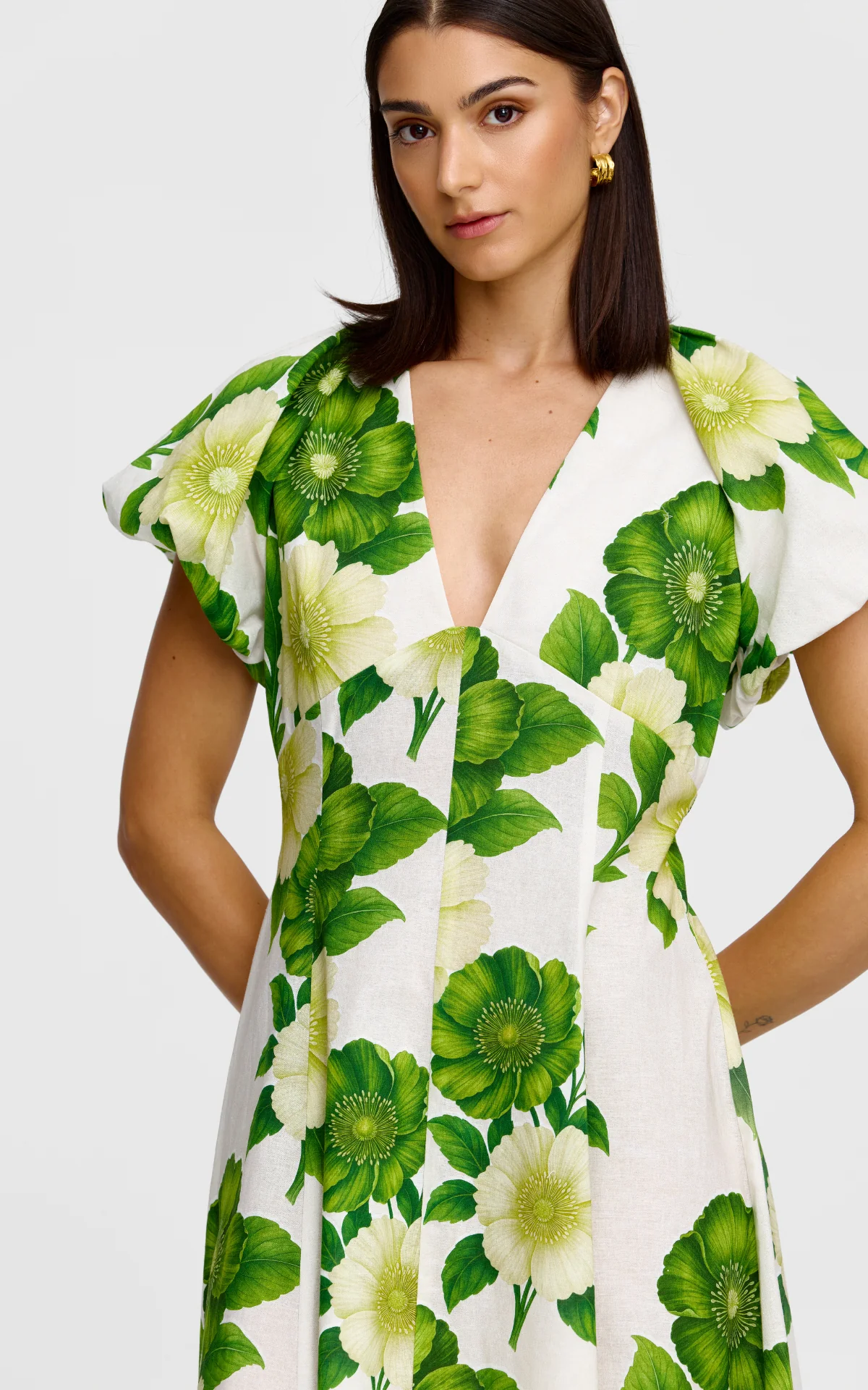 The Theo dress features a deep v-cut neckline, flouncy lined sleeves and seam design lines running the length of the dress. This thoughtfully designed piece has a relaxed structure that gracefully skims the body.